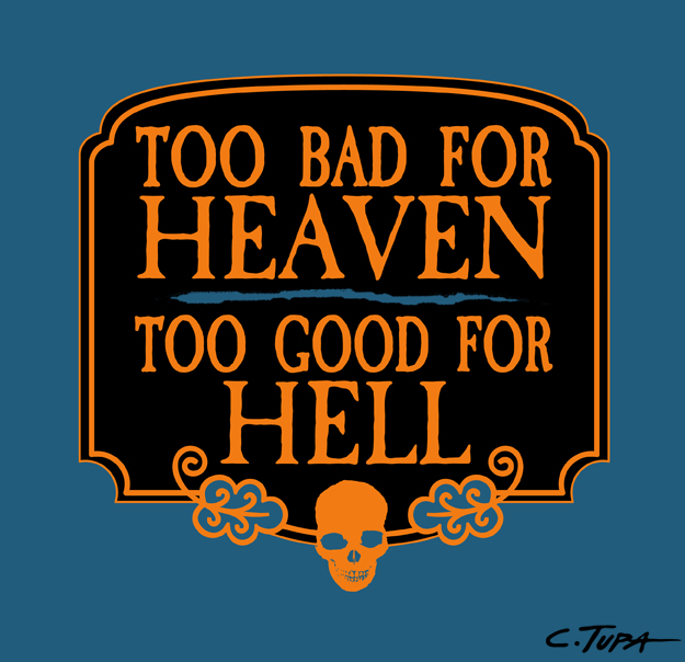 Today’s Halloween art is a bit different. At work I met a 90 year old woman and I congratulated her on her long life. She told me Gabriel and the Devil are fighting over her so until they decide who gets her she’s stuck here on Earth. It was such a great concept I had to make a t-shirt: