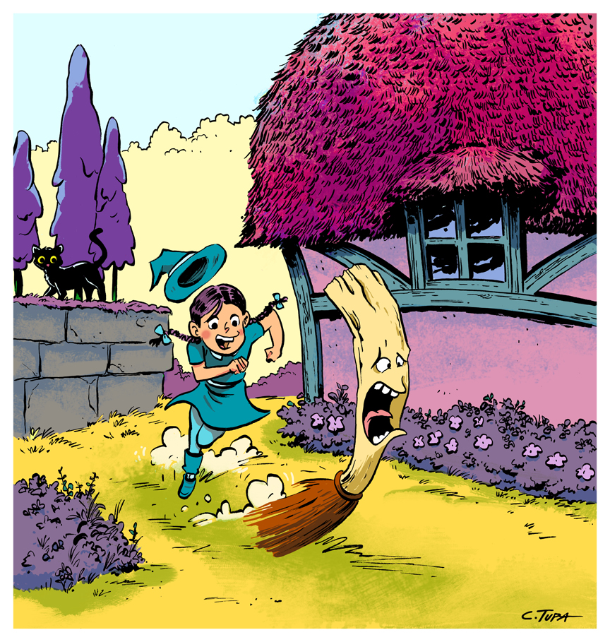 Day 27 of 31 days of Halloween art: A little witch and her runaway broom!