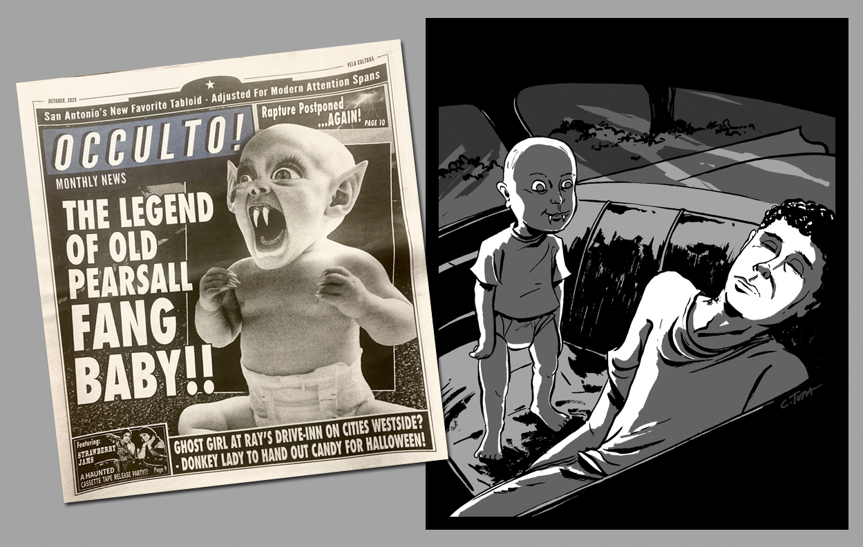 For today’s Halloween art I am sharing with you an illustration I did this month for the Occulto newspaper, published monthly in San Antonio, TX. It’s full of spooky, fun, paranormal goodness! My illustration was for the article about the Pearsall Fang Baby!